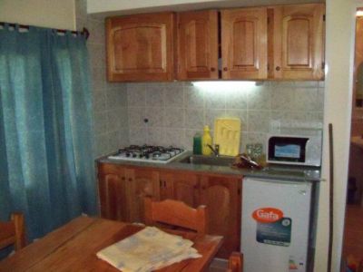 Las cabañas, totalmente equipadas para 4 a 6 personas, se distribuyen en dos plantas, ofreciendo un espacio amplio y funcional. En la planta baja, un acogedor living con dos camas individuales y televisión por cable invita al descanso y la reunión familiar. La cocina-comedor, equipada con anafe, microondas, heladera y vajilla completa, permite preparar cómodamente las comidas y compartir momentos agradables alrededor de la mesa. El baño completa este nivel.
