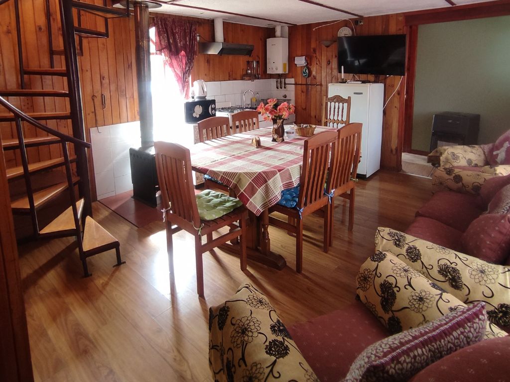 Inside, the Cabaña Encantos is equipped with everything you need for a pleasant stay: a full kitchen, living room with comfortable armchairs, warm bedrooms and a fireplace that creates a cozy atmosphere, ideal for the cool Chiloé nights. Its simple and elegant decoration, with details inspired by the culture and traditions of Chiloé, contributes to a calm and relaxing atmosphere.