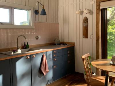 En el interior, un espacio abierto integra el living, comedor, cocina y el dormitorio principal, combinando funcionalidad y calidez. El baño, cuidadosamente diseñado, complementa este ambiente acogedor. Una escalera de dos posiciones da acceso a un altillo abierto, donde dos camas individuales ofrecen un espacio adicional para descansar.
