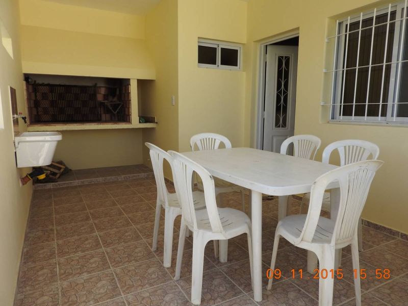 Galería amplia: parrilla con luz, pileta para lavar, tendedero y mesa de plástico con siete sillas.