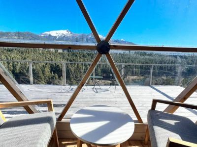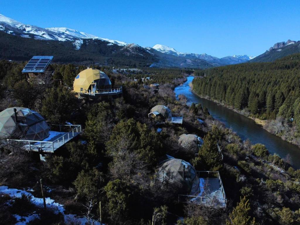 Cada domo está construido en madera y cuenta con una terraza propia, la cual proporciona una hermosa vista al río y lago Meliquina, rodeado de un amplio bosque de pinos. La estadía mínima es de dos noches y el desayuno está incluido.