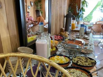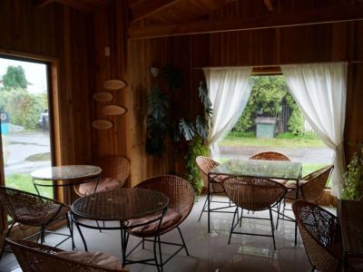 Dining area, living room shared among guests, spacious rooms, some with private bathrooms.