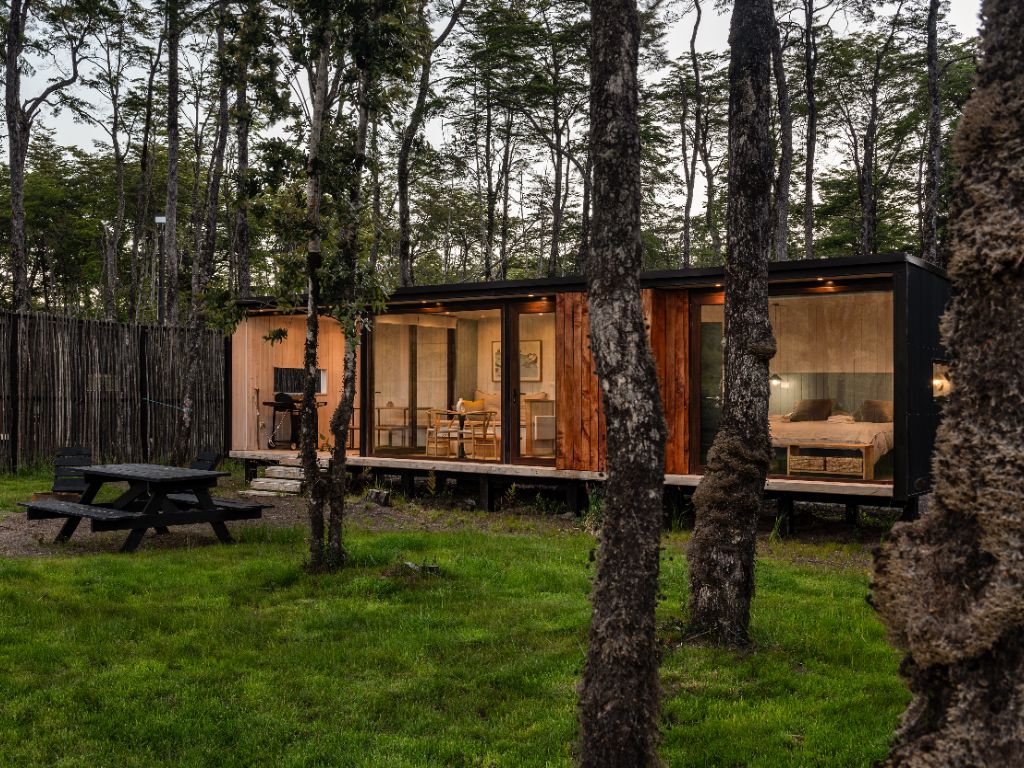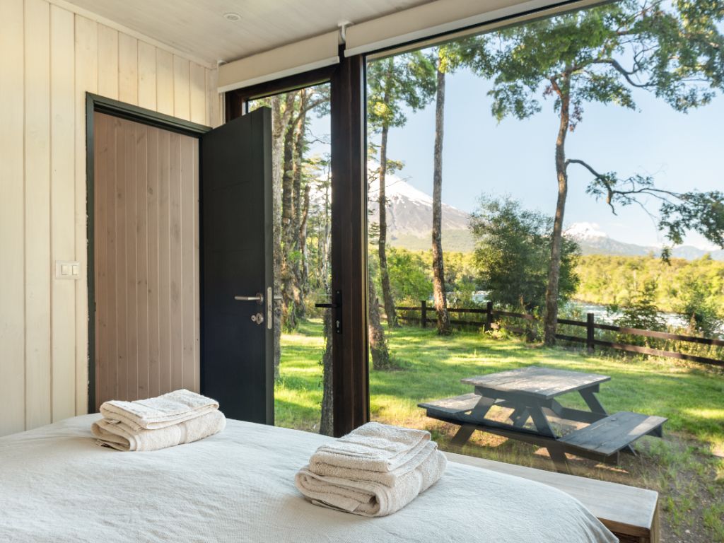 The complex is made up of four modular houses that share an exterior with views of the river and volcanoes. Guests can tour the Fundo La Nueva Carinthia, which extends through a forest and the riverbank. In addition, rafting activities and other aquatic experiences can be done in the area. Free Starlink Wi-Fi is also provided for a comfortable and connected stay.