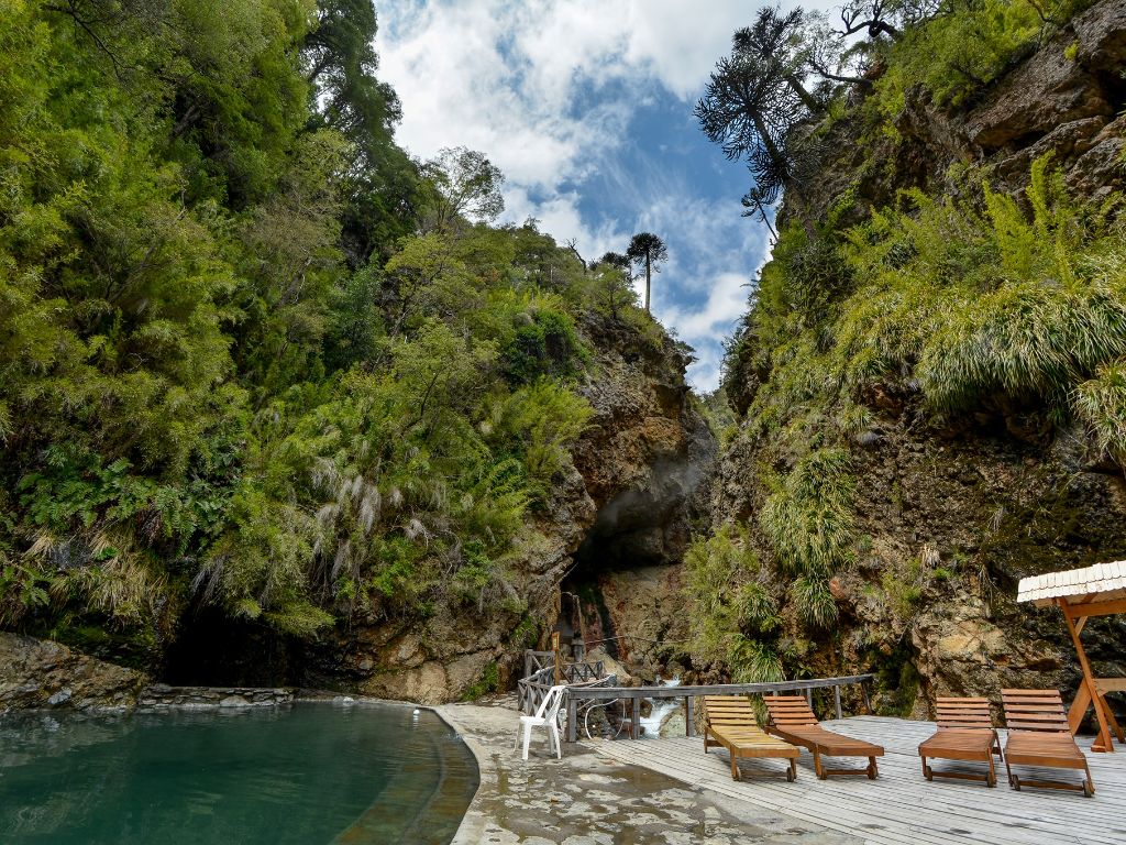 Its thermal spring springs up at a temperature of 86° degrees inside a grotto located at the base of the Dillo River ravine. Inside this cave, eight high-pressure geysers emerge, generating a curtain of steam that radically contrasts with the green of the araucarias and the aggressive white of the flow of the Dillo River.