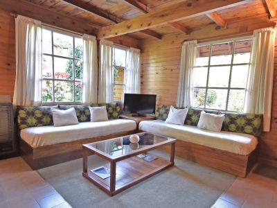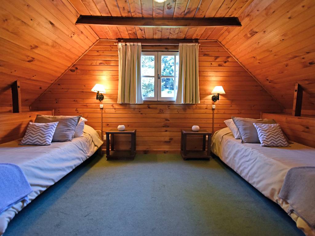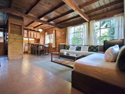Las cabañas, construidas en auténtico Ciprés, se distribuyen en dos plantas y ofrecen un espacio acogedor y confortable para el descanso. Tres habitaciones, dos baños, un amplio living comedor y un bello jardín conforman el escenario perfecto para disfrutar en compañía.