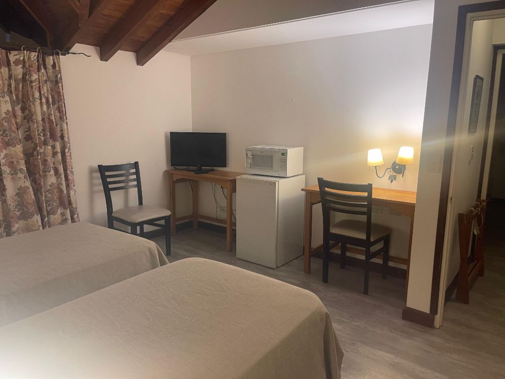 También dispone de acogedoras habitaciones para dos personas, que incluyen frigobar, microondas, jarra eléctrica, vajilla y un televisor, además de ropa de cama y toallas, todo complementado con un baño completo para una experiencia funcional y confortable.
