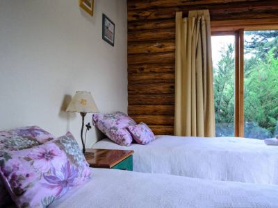 Surrounded by an incomparable natural setting, Cabañas Los Ciruelos in Trevelin invites its guests to immerse themselves in an atmosphere of peace and harmony. Located in a lush park with fruit trees, plum trees, lavender, tulips and apple trees, the cabin opens to the outside through a large window, allowing the green, the colors and the mountains to be the magical frame of the landscape.