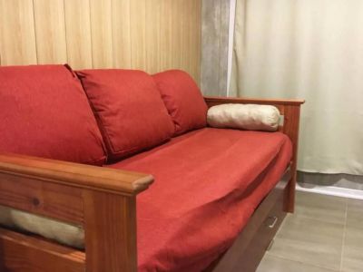 Está totalmente equipado, tiene un dormitorio con dos camas sommier, en el living hay un sofá que se convierte en una cama 2 dos plazas, además tiene anafe, licuadora, pava electrica, todo para que su estadía sea lo más cómodo.