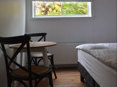 Dormitorio doble con baño y camas individuales en dormitorio. Espacio común, terraza, WiFi gratuito, servicio de lavandería y muchos servicios alrededor.