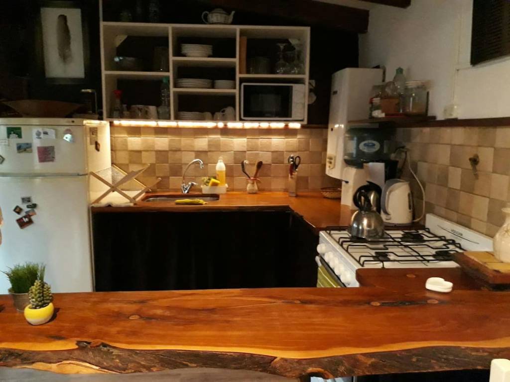El living dispone de un hogar a leña y muchísimos libros. El predio es compartido con otras casas.