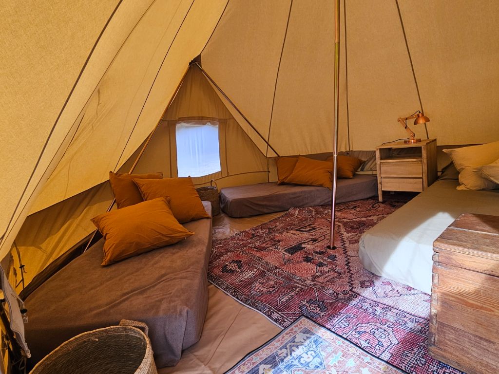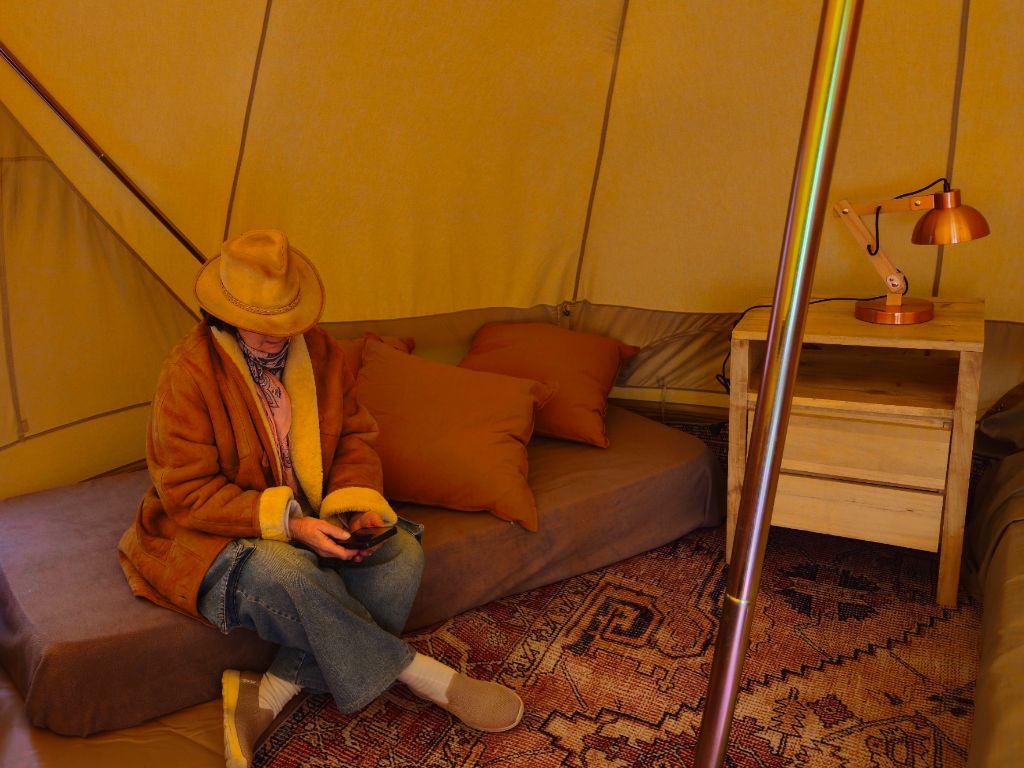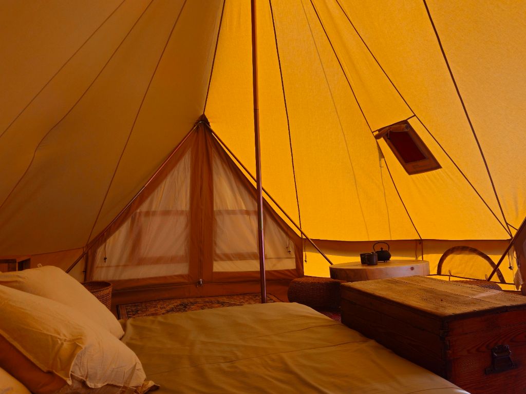 Las amplias carpas de 22 m², con capacidad para alojar hasta cuatro personas, están equipadas con todas las comodidades de una habitación de hotel: iluminación, mesas de luz, alfombras y conexión WiFi. Cuentan además con una salamandra a pellets automática, que garantiza un ambiente cálido incluso en los días más fríos, y con baño privado con ducha.